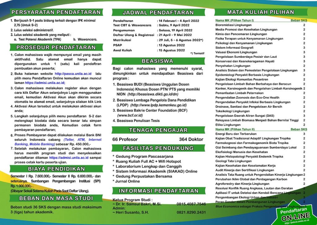 • Pengumuman Pembukaan Pendaftaran Penerimaan Mahasiswa Baru (PMB) Program Pascasarjana Universitas Lampung Program Doktor (S3), Magister (S2) dan Spesialis (Sp1) Tahun Akademik 2025/2026 28 February 2025