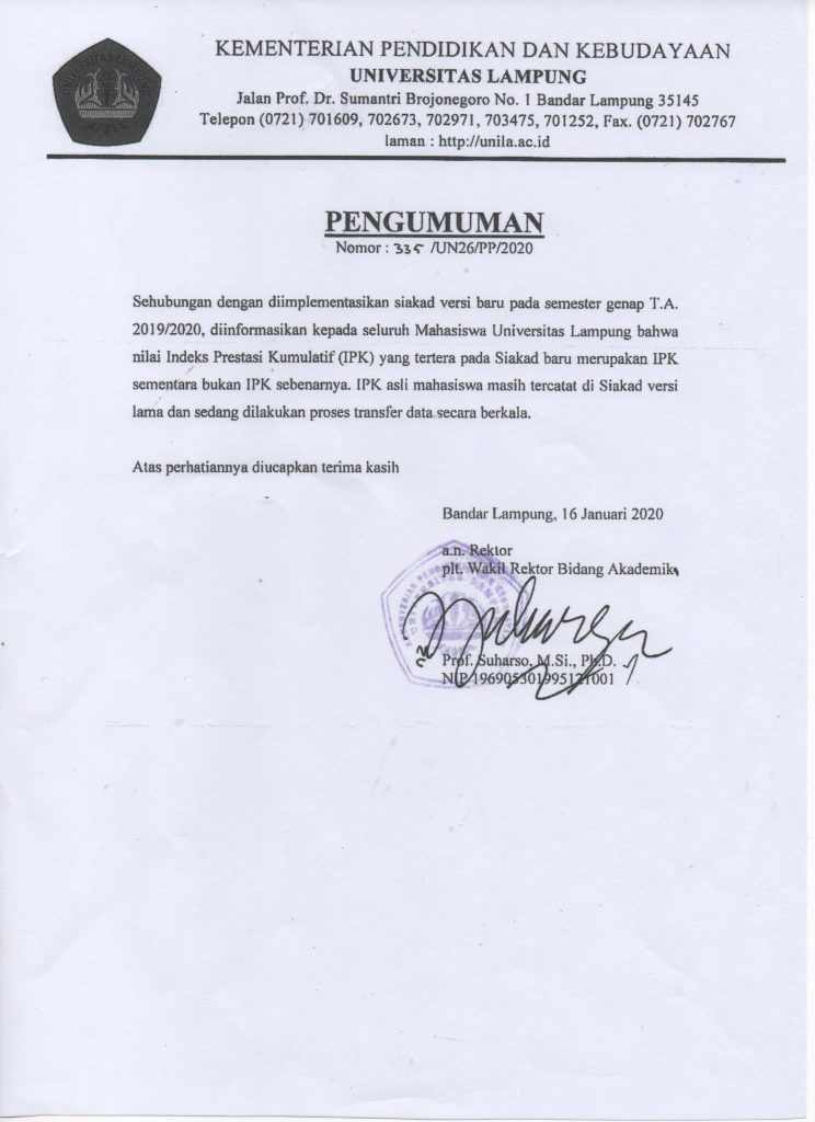 • Pengumuman Penyelenggaraan Dan Pendaftaran Wisuda Universitas Lampung Periode III Bulan Januari 2026 Tahun Akademik 2025/2026 27 November 2025