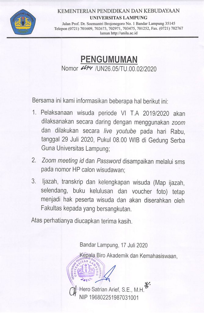 • Pengumuman Penyelenggaraan Dan Pendaftaran Wisuda Universitas Lampung Periode II Bulan November 2024 Tahun Akademik 2024/2025 3 October 2024